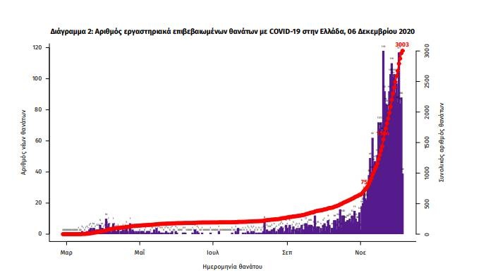 Τέλος, έχουμε 101 ακόμα καταγεγραμμένους θανάτους και 3.003 θανάτους συνολικά στη χώρα. 1197 (39.9%) γυναίκες και οι υπόλοιποι άνδρες. Η διάμεση ηλικία των θανόντων συμπολιτών μας ήταν τα 79 έτη και το 96.2% είχε κάποιο υποκείμενο νόσημα ή/και ηλικία 70 ετών και άνω.