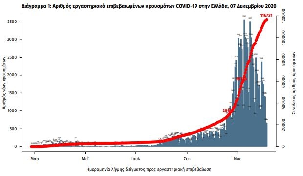 Η ημερήσια κατανομή των επιβεβαιωμένων κρουσμάτων είναι η ακόλουθη (η γραμμή παριστάνει την συνολική, αθροιστική κατανομή των κρουσμάτων)