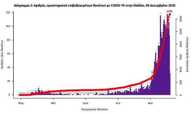 Ακόμη, καταγράκαν 102 νέοι θάνατοι, με τον συνολικό αριθμό στη χώρα μας να ανέρχεται στις 3.194. Από τους ασθενείς που κατέληξαν, οι 1.268 (39,7%) ήταν γυναίκες και οι υπόλοιποι άνδρες. Η διάμεση ηλικία των θανόντων συμπολιτών μας ήταν τα 79 έτη και το 96,2% είχε κάποιο υποκείμενο νόσημα ή/και ηλικία 70 ετών και άνω.