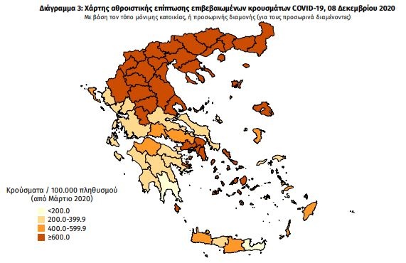 Ο χάρτης αποτυπώνει τη γεωγραφική κατανομή των συνολικών κρουσμάτων COVID-19 (από την αρχή της επιδημίας) ανά Περιφερειακή Ενότητα της χώρας, με βάση την δηλωθείσα διεύθυνση μόνιμης κατοικίας του ασθενούς, ή τη διεύθυνση προσωρινής διαμονής για τους τουρίστες και άλλους προσωρινά διαμένοντες στην Ελλάδα.