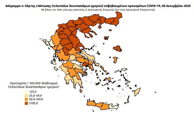 Ο χάρτης αποτυπώνει τη γεωγραφική κατανομή των συνολικών κρουσμάτων COVID-19 (από την αρχή της επιδημίας) ανά Περιφερειακή Ενότητα της χώρας, με βάση την δηλωθείσα διεύθυνση μόνιμης κατοικίας του ασθενούς, ή τη διεύθυνση προσωρινής διαμονής για τους τουρίστες και άλλους προσωρινά διαμένοντες στην Ελλάδα.