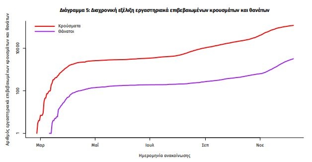 Η διαχρονική εξέλιξη των συνολικών κρουσμάτων και συνολικού αριθμού των θανάτων ασθενών COVID-19 παρουσιάζεται στο ακόλουθο διάγραμμα (σε λογαριθμική κλίμακα).