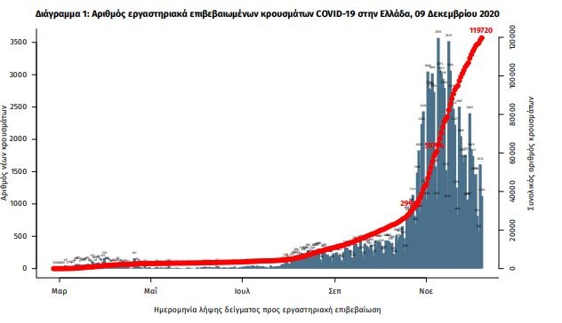 Η ημερήσια κατανομή των επιβεβαιωμένων κρουσμάτων είναι η ακόλουθη (η γραμμή παριστάνει την συνολική, αθροιστική κατανομή των κρουσμάτων).