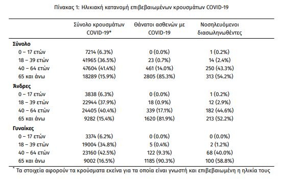 Τέλος, καταγράφηκαν 95 ακόμα θάνατοι, με τον συνολικό αριθμό τους να ανέρχεται στους 3.289. Από τους ασθενείς που κατέληξαν, οι 1.312 (39,9%) γυναίκες και οι υπόλοιποι άνδρες. Η διάμεση ηλικία των θανόντων ήταν τα 79 έτη και το 96,2% είχε κάποιο υποκείμενο νόσημα ή/και ηλικία 70 ετών και άνω