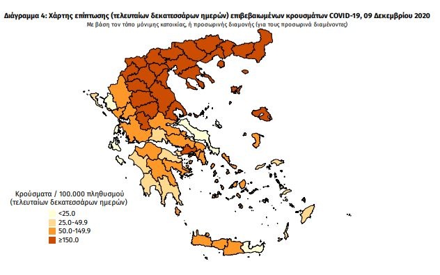 Ο χάρτης αποτυπώνει τη γεωγραφική κατανομή των συνολικών κρουσμάτων COVID-19 (από την αρχή της επιδημίας) ανά Περιφερειακή Ενότητα της χώρας, με βάση την δηλωθείσα διεύθυνση μόνιμης κατοικίας του ασθενούς, ή τη διεύθυνση προσωρινής διαμονής για τους τουρίστες και άλλους προσωρινά διαμένοντες στην Ελλάδα.