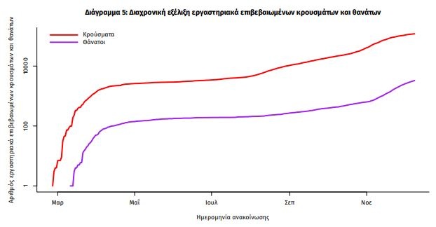 Η διαχρονική εξέλιξη των συνολικών κρουσμάτων και συνολικού αριθμού των θανάτων ασθενών COVID-19 παρουσιάζεται στο ακόλουθο διάγραμμα (σε λογαριθμική κλίμακα).