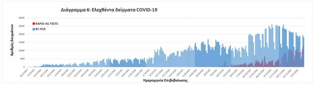 Από την 1η Ιανουαρίου 2020 μέχρι σήμερα, στα εργαστήρια που διενεργούν ελέγχους για τον νέο κορονοϊό (SARS-CoV-2) και που δηλώνουν συστηματικά στον ΕΟΔΥ το σύνολο των δειγμάτων που ελέγχουν, έχουν συνολικά ελεγχθεί 2.522.718 κλινικά δείγματα ενώ από Μονάδες Υγείας και Κλιμάκια του ΕΟΔΥ που διενεργούν ελέγχους Rapid Ag έχουν ελεγχθεί 291.801 δείγματα.
