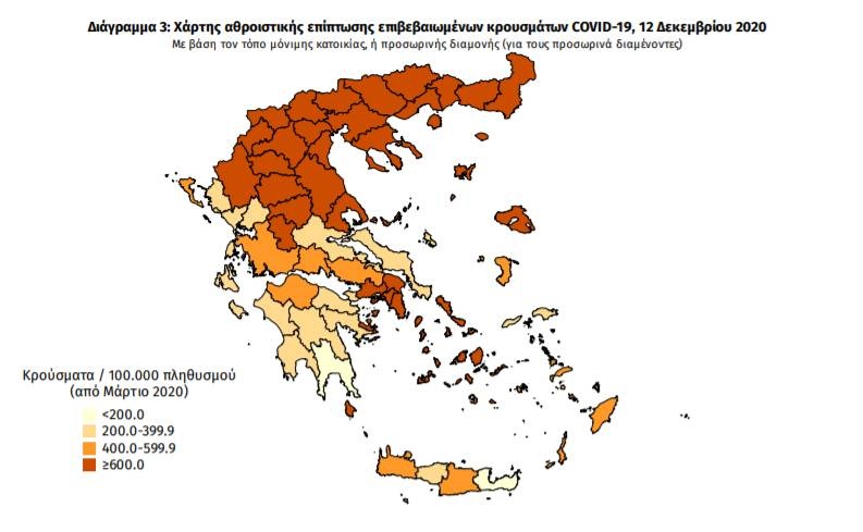 Ο χάρτης αποτυπώνει τη γεωγραφική κατανομή των συνολικών κρουσμάτων COVID-19 (από την αρχή της επιδημίας) ανά Περιφερειακή Ενότητα της χώρας, με βάση την δηλωθείσα διεύθυνση μόνιμης κατοικίας του ασθενούς, ή τη διεύθυνση προσωρινής διαμονής για τους τουρίστες και άλλους προσωρινά διαμένοντες στην Ελλάδα.