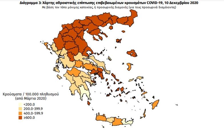 Ο χάρτης αποτυπώνει τη γεωγραφική κατανομή των συνολικών κρουσμάτων COVID-19 (από την αρχή της επιδημίας) ανά Περιφερειακή Ενότητα της χώρας, με βάση την δηλωθείσα διεύθυνση μόνιμης κατοικίας του ασθενούς, ή τη διεύθυνση προσωρινής διαμονής για τους τουρίστες και άλλους προσωρινά διαμένοντες στην Ελλάδα.