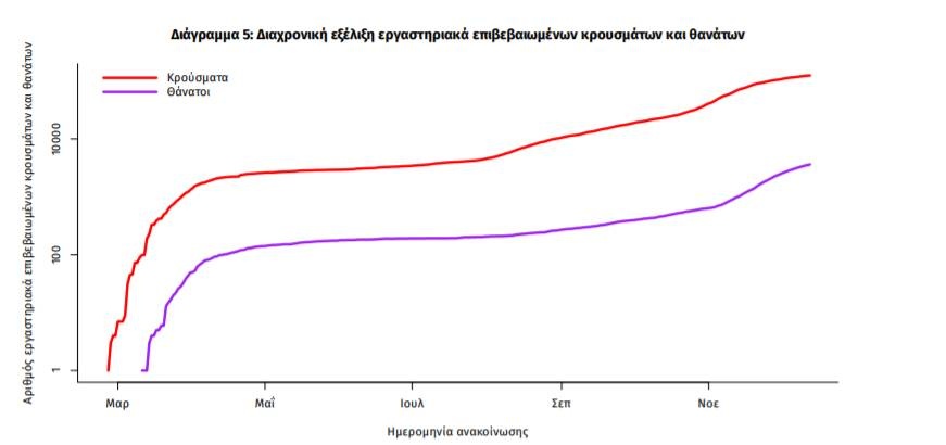 Η διαχρονική εξέλιξη των συνολικών κρουσμάτων και συνολικού αριθμού των θανάτων ασθενών COVID-19 παρουσιάζεται στο ακόλουθο διάγραμμα (σε λογαριθμική κλίμακα).