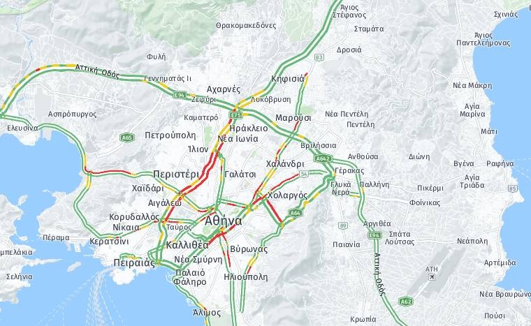 Η βροχή που πέφτει στην Αττική έχει φέρει προβλήματα σε κεντρικές αρτηρίες της Αθήνας και, με πολλούς δρόμους να βρίσκονται στο «κόκκινο».