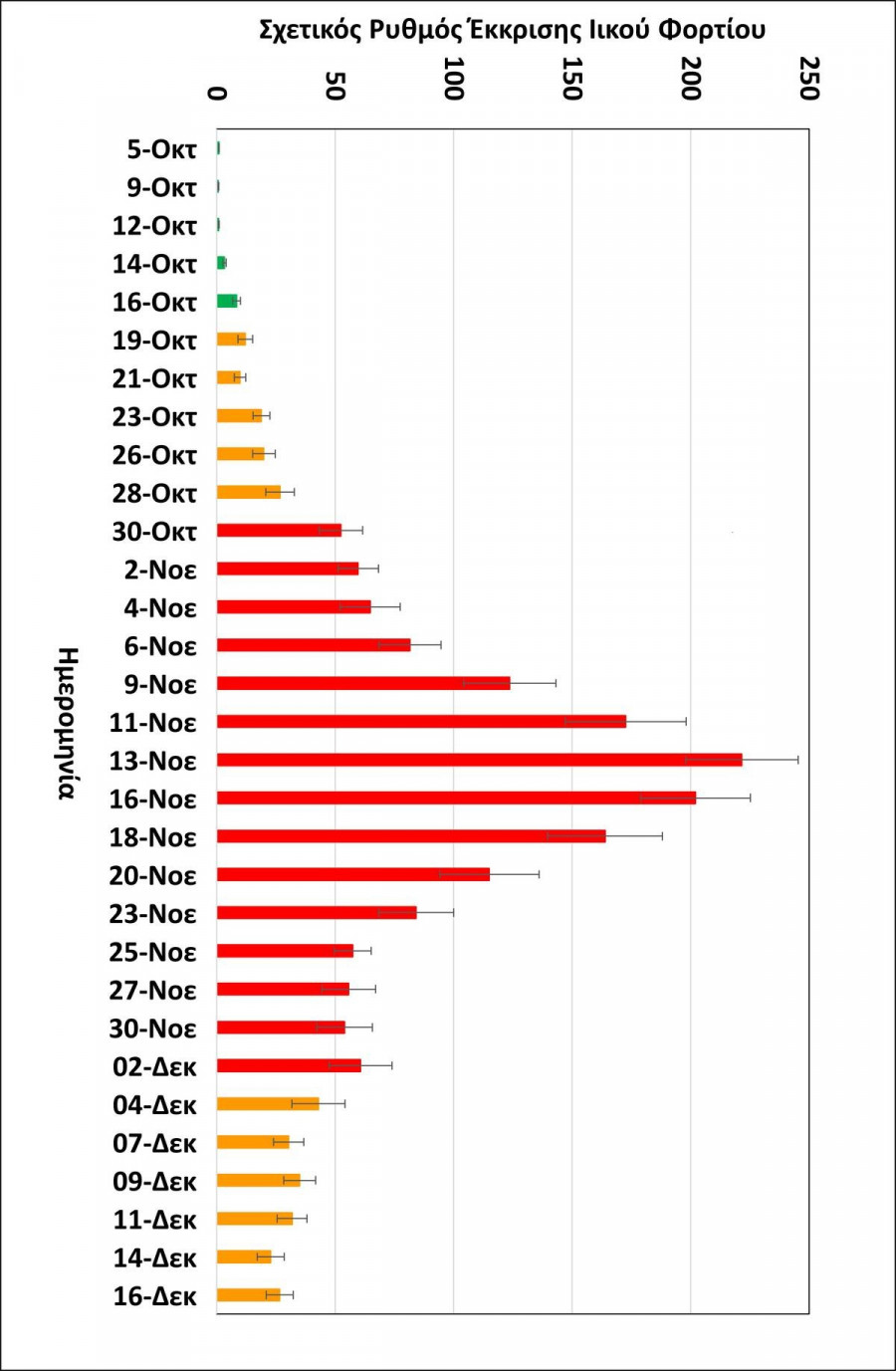 Στο διάγραμμα που παρουσιάζει το ΑΠΕ-ΜΠΕ φαίνεται ότι τις τελευταίες δύο εβδομάδες και από τη στιγμή που το ιικό φορτίο πέρασε στο πορτοκαλί από το κόκκινο επίπεδο, υπάρχουν μικρές αυξομειώσεις, που δείχνουν ότι έχει ανακοπεί η τάση αποκλιμάκωσης, η οποία είχε καταγραφεί από τα μέσα έως τα τέλη Νοεμβρίου.