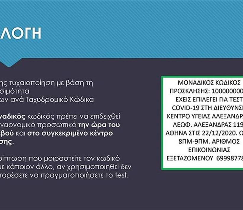 Η επιλογή θα γίνεται μέσα από τυχαιοποίηση μέσω υπολογιστικού αλγορίθμου. Για την διενέργεια του τεστ δικαιολογείται τρίωρη αποχή από την εργασία. Ο πολίτης θα ενημερώνεται για το αποτέλεσμα του τεστ, και η πληροφορία του τεστ θα περνά στο μητρώο covid.