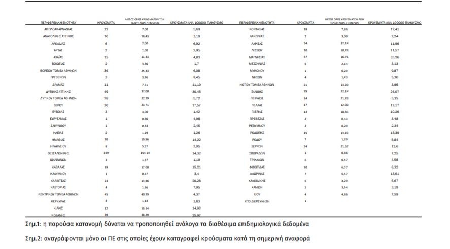 Η κατανομή των 885 νέων εγχώριων κρουσμάτων ανά Περιφερειακή Ενότητα παρουσιάζεται στον κατωτέρω πίνακα.