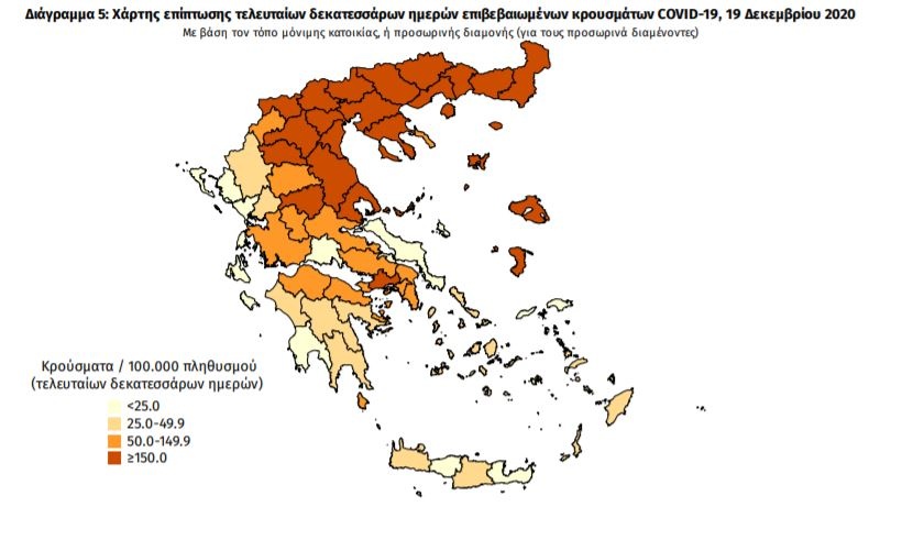 Πίνακας 2: Ημερήσιος αριθμός και κρούσματα ανά 100.000 πληθυσμού επιβεβαιωμένων εγχώριων κρουσμάτων COVID-19 ανά περιφερειακή ενότητα στις 19 Δεκεμβρίου 2020.