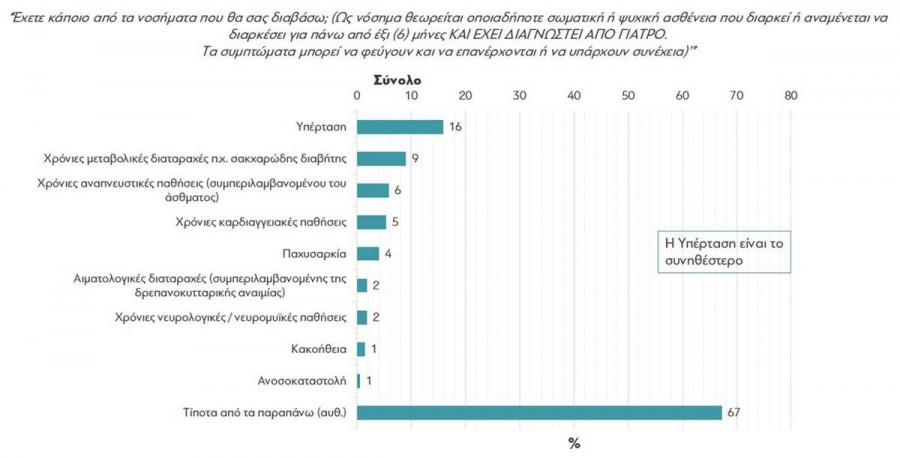 Τέλος, αξίζει να σημειωθούν δύο άλλα ενδιαφέροντα ευρήματα. Ένας στους τρεις Έλληνες δηλώνουν ότι πάσχουν από ένα διαγνωσμένο υποκείμενο νόσημα, με συχνότερα την υπέρταση (15,8%), τις χρόνιες μεταβολικές παθήσεις, όπως ο σακχαρώδης διαβήτης (9%) και τα χρόνια αναπνευστικά νοσήματα, όπως το άσθμα (5,8%). Όπως αναφέρθηκε παραπάνω, τα μέλη αυτής της πολύ μεγάλης ομάδας δηλώνουν σε ποσοστό μεγαλύτερο του γενικού πληθυσμού (72%) ότι προτίθενται να κάνουν και το εμβόλιο για τον κορονοϊό.