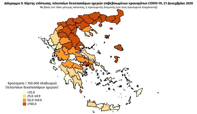 Ο χάρτης αποτυπώνει τη γεωγραφική κατανομή των συνολικών κρουσμάτων COVID-19 (από την αρχή της επιδημίας) ανά Περιφερειακή Ενότητα της χώρας, με βάση την δηλωθείσα διεύθυνση μόνιμης κατοικίας του ασθενούς, ή τη διεύθυνση προσωρινής διαμονής για τους τουρίστες και άλλους προσωρινά διαμένοντες στην Ελλάδα.