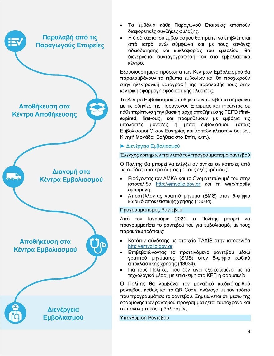 Επίσης, το Εμβολιαστικό Κέντρο καταχωρεί στην ηλεκτρονική εφαρμογή τα στοιχεία της συσκευασίας των εμβολίων, που χρησιμοποιήθηκε για τον εμβολιασμό του Πολίτη.