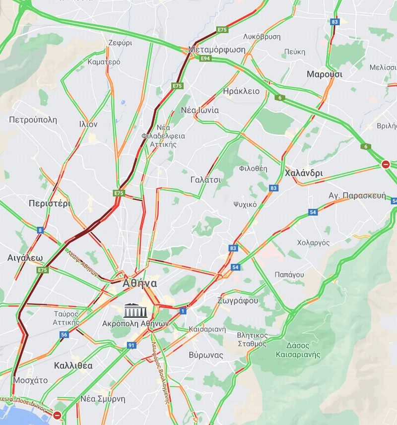 Τα προβλήματα λόγω της κίνησης, αποτυπώνονται και στους σχετικούς χάρτες όπου φαίνονται οι δρόμοι που αντιμετωπίζουν δυσκολίες με έντονο κόκκινο χρώμα. Είναι χαρακτηριστικό πως το ρεύμα της καθόδου στην Εθνική Οδό έχει συμφόρηση από την Αττική Οδό μέχρι το ύψος της Λεωφόρου Αθηνών, ενώ το ρεύμα της ανόδου έχει έντονη κυκλοφορία από την αρχή, στη Λεωφόρο Ποσειδώνος, μέχρι το ύψος της οδού Λιοσίων.
