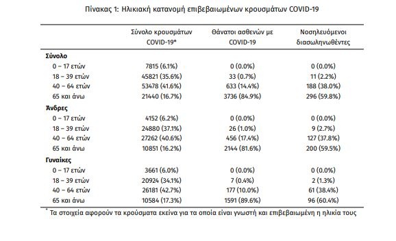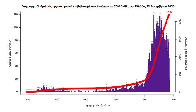 Τέλος, σύμφωνα με τον ΕΟΔΥ έχουμε 62 ακόμα καταγεγραμμένους θανάτους και 4.402 θανάτους συνολικά στη χώρα. 1.776 (40,3%) γυναίκες και οι υπόλοιποι άνδρες. Η διάμεση ηλικία των θανόντων συμπολιτών μας ήταν τα 79 έτη και το 95,5% είχε κάποιο υποκείμενο νόσημα ή/και ηλικία 70 ετών και άνω.
