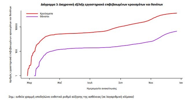 Η διαχρονική εξέλιξη των συνολικών κρουσμάτων και συνολικού αριθμού των θανάτων ασθενών COVID-19 παρουσιάζεται στο ακόλουθο διάγραμμα.