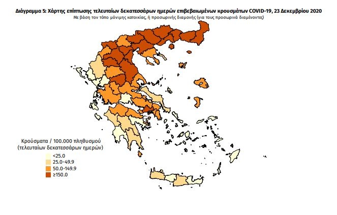 Ο χάρτης αποτυπώνει τη γεωγραφική κατανομή των συνολικών κρουσμάτων COVID-19 (από την αρχή της επιδημίας) ανά Περιφερειακή Ενότητα της χώρας, με βάση την δηλωθείσα διεύθυνση μόνιμης κατοικίας του ασθενούς, ή τη διεύθυνση προσωρινής διαμονής για τους τουρίστες και άλλους προσωρινά διαμένοντες στην Ελλάδα.