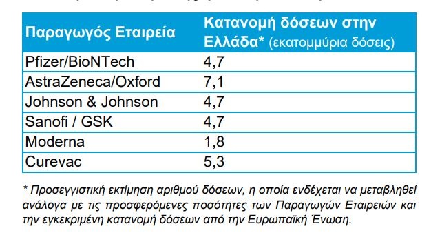 Όπως αναφέρεται στο σχέδιο η Ελλάδα περιμένει 4,7 εκατ. δόσεις από την Pfizer, 7,1 εκατ. δόσεις από την Astrazeneca, 4,7 εκατ. ευρώ από την Johnson & Johnson, 4,7 εκατ. από την Sanofi, 1,8 εκατ. δόσεις από τη Moderna και 5,3 εκατ. δόσεις από την Curevac.
