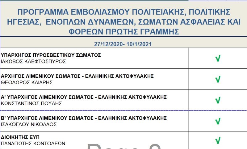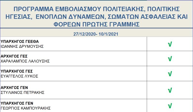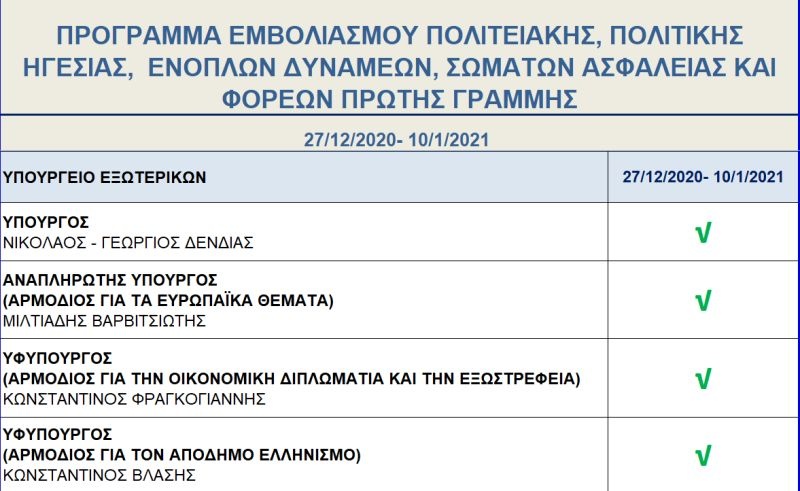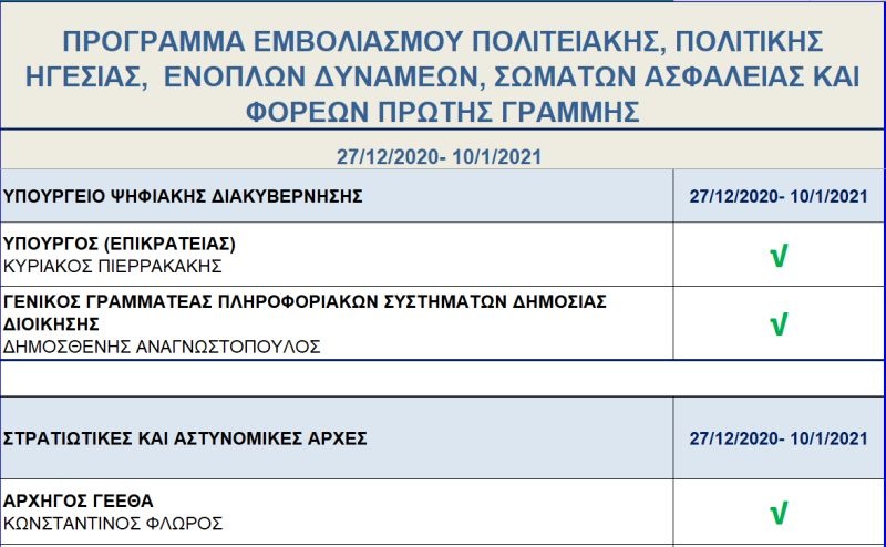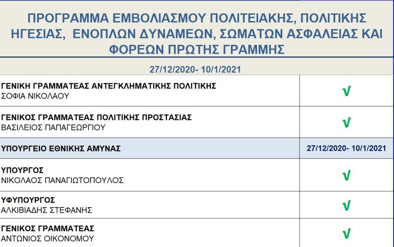 Ακριβείς ημερομηνίες για τον εμβολιασμό του καθενός δεν αναφέρονται στο πρόγραμμα που ανακοινώθηκε, ωστόσο, όλοι έχουν επικυρώσει την παρουσία τους στη διαδικασία που θα διεξαχθεί στο χρονικό διάστημα που προαναφέρεται. Πρώτη στον κατάλογο των σημαντικών προσώπων που θα εμβολιαστούν, αναγράφεται η Πρόεδρος της Δημοκρατίας, Κατερίνα Σακελλαροπούλου, ενώ ακολουθεί ο πρωθυπουργός, Κυριάκος Μητσοτάκης και ο Πρόεδρος της Βουλής, Κωνσταντίνος Τασούλας.