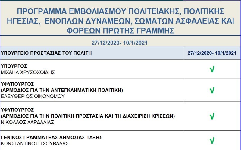 Ακολουθούν οι υπουργοί, υφυπουργοί, αναπληρωτές υπουργοί και γενικοί γραμματείς των υπουργείων της ελληνικής κυβέρνησης αλλά και οι στρατιωτικές και αστυνομικές αρχές. Οι Ένοπλες Δυνάμεις, η ΕΛ.ΑΣ., η πυροσβεστική και το λιμενικό σώμα δια των αρχηγών και υπαρχηγών τους θα υποβληθούν με τη σειρά τους στον εμβολιασμό.