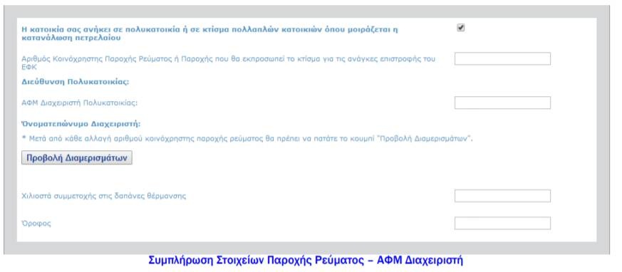 Στη συνέχεια ο αιτών καλείται να «τσεκάρει» για την περίπτωση που η κατοικία ανήκει σε κτίσμα πολλαπλών κατοικιών ή σε πολυκατοικία όπου μοιράζεται η κατανάλωση του πετρελαίου. Σε θετική απάντηση πρέπει απαραίτητα να συμπληρώσει τα παρακάτω εμφανιζόμενα στοιχεία.