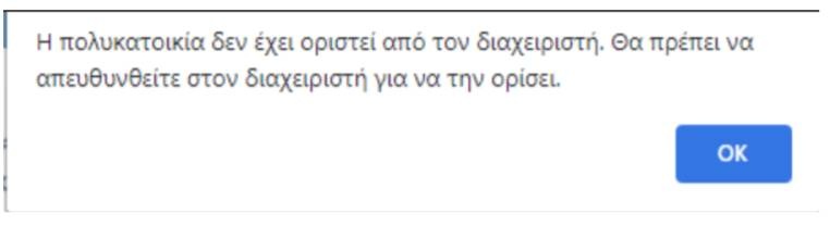 Στη συνέχεια ενεργοποιείτε την επιλογή «Προβολή Διαμερισμάτων». Εάν δεν έχει οριστεί η πολυκατοικία από τον διαχειριστή εμφανίζεται το ακόλουθο μήνυμα, το οποίο σημαίνει ότι ο χρήστης θα πρέπει να εισάγει μόνος του τα στοιχεία του διαμερίσματός του.