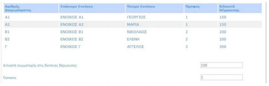 Ο χρήστης μπορεί να επιλέξει το διαμέρισμά του και αυτό θα μεταφερθεί στην αίτησή του γεμίζοντας τις πληροφορίες των χιλιοστών θέρμανσης και του ορόφου, χωρίς να υπάρχει δυνατότητα επεξεργασίας τους: