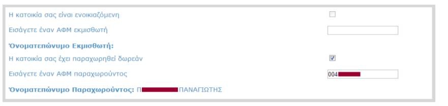 Στην επόμενη ενότητα ζητούνται στοιχεία που αφορούν την κύρια κατοικία και συγκεκριμένα αν η κατοικία είναι ενοικιαζόμενη ή έχει παραχωρηθεί δωρεάν. Σε όποια περίπτωση ισχύει αυτό, ο χρήστης καλείται να συμπληρώσει και τον Α.Φ.Μ. ενός εκ των εκμισθωτών ή των δωρεάν παραχωρούντων. Εάν η κατοικία είναι ιδιόκτητη, τότε ο χρήστης δε συμπληρώνει τίποτα από αυτά.