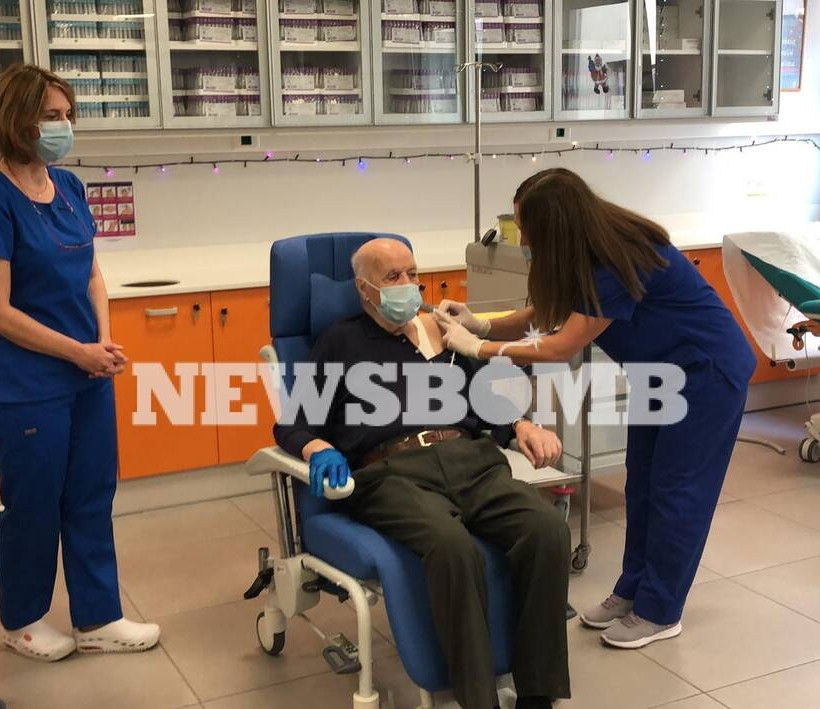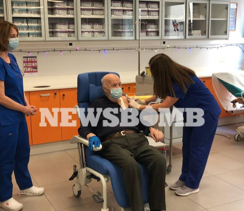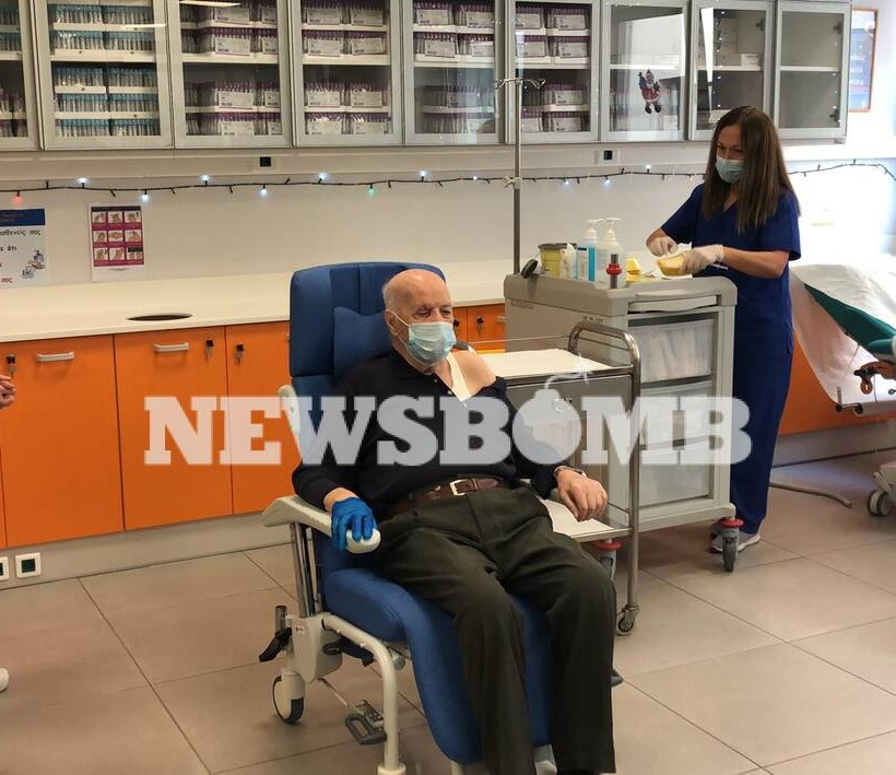 Μισή ώρα αργότερα, ο κύριος Μιχάλης Γιοβανίδης, 85 ετών πήρε και εκείνος θέση για να εμβολιαστεί. Ο κύριος Γιοβανίδης είναι φιλοξενούμενος στη Μονάδα Φροντίδας Ηλικιωμένων στο Νοσοκομείο Ευαγγελισμός.
