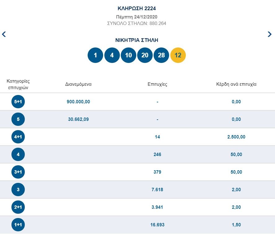 Οι τυχεροί αριθμοί που έβγαλε η κληρωτίδα της περασμένης κλήρωσης είναι οι: 1, 4, 10, 20, 28 και Τζόκερ ο αριθμός 12.
