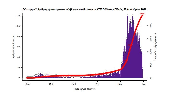 Τέλος, σύμφωνα με τον ΕΟΔΥ, έχουμε 58 ακόμα καταγεγραμμένους θανάτους και 4.730 θανάτους συνολικά στη χώρα. 1923 (40,7%) γυναίκες και οι υπόλοιποι άνδρες. Η διάμεση ηλικία των θανόντων συμπολιτών μας ήταν τα 79 έτη και το 95.5% είχε κάποιο υποκείμενο νόσημα ή/και ηλικία 70 ετών και άνω.