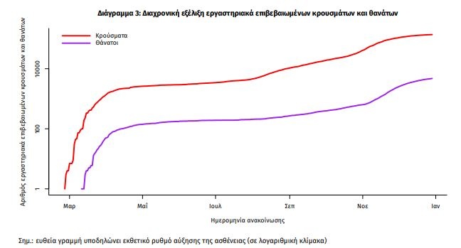 Η διαχρονική εξέλιξη των συνολικών κρουσμάτων και συνολικού αριθμού των θανάτων ασθενών COVID-19 παρουσιάζεται στο ακόλουθο διάγραμμα.