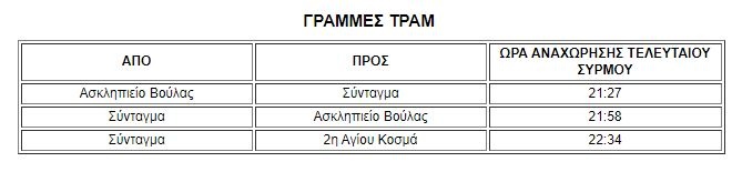 Αναφορικά με τα τελευταία δρομολόγια του Τραμ έχουν ως εξής: Από Σύνταγμα προς Βούλα στις 21.58 και από Σύνταγμα εως Άγιο Κοσμά στις 22.34. Από Βούλα προς Σύνταγμα στις 21.27 και από Βούλα προς Άγιο Αλέξανδρο στις 23.04.