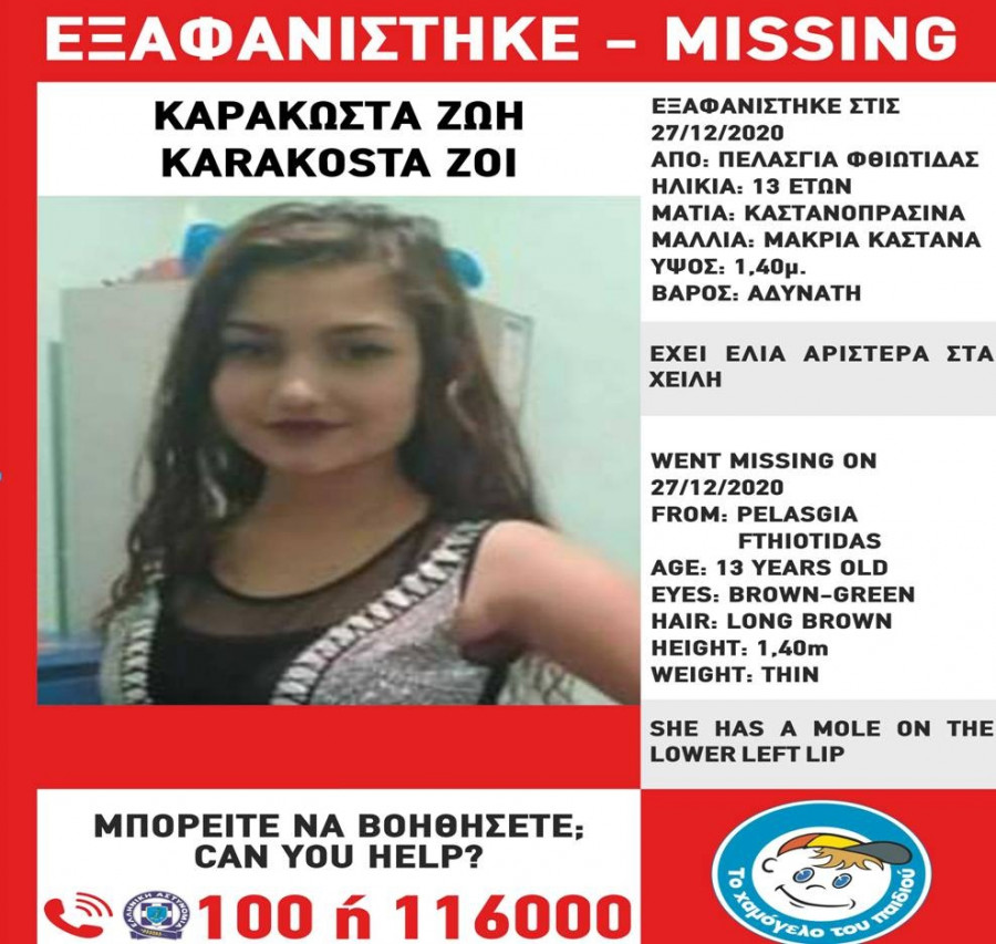 Στις 27/12/2020, πρωινές ώρες, εξαφανίστηκε από το σπίτι της στην Πελασγία Φθιώτιδας, η Ζωή Καρακώστα, 13 ετών, ελληνικής καταγωγής.