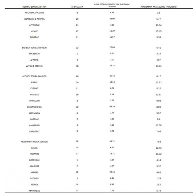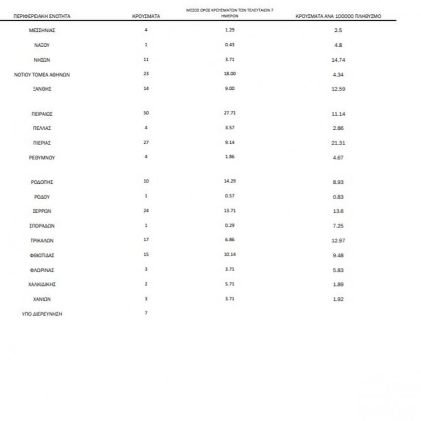 Από το σύνολο των 800 νέων κρουσμάτων του νέου ιού στη χώρα 19 είναι εισαγόμενα και 11 εντοπίστηκαν κατόπιν ελέγχων στις πύλες εισόδου της χώρας. Η κατανομή των 781 νέων εγχώριων κρουσμάτων ανά Περιφερειακή Ενότητα παρουσιάζεται στον κατωτέρω πίνακα.
