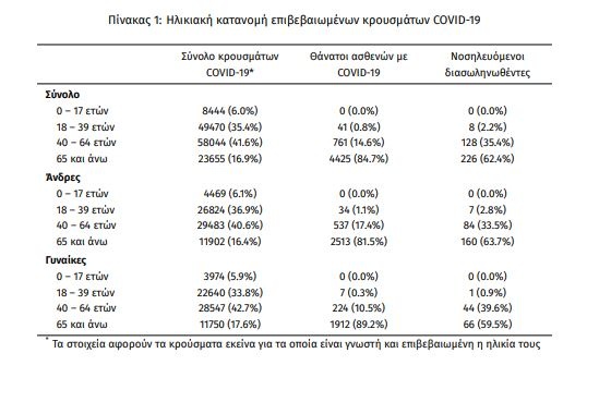 Η ηλικιακή κατανομή των (α) συνολικών κρουσμάτων, (β) των περιστατικών που κατέληξαν σε θάνατο και (γ) των ασθενών που νοσηλεύονται διασωληνωμένοι, είναι η ακόλουθη: