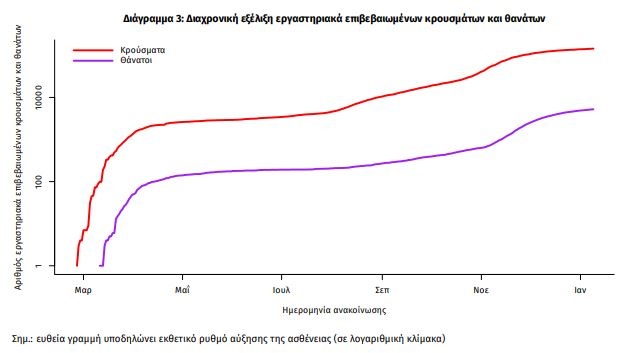 Η διαχρονική εξέλιξη των συνολικών κρουσμάτων και συνολικού αριθμού των θανάτων ασθενών COVID-19 παρουσιάζεται στο ακόλουθο διάγραμμα.