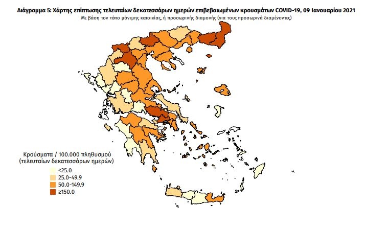 Πίνακας 2: Ημερήσιος αριθμός και κρούσματα ανά 100.000 πληθυσμού επιβεβαιωμένων εγχώριων κρουσμάτων COVID-19 ανά περιφερειακή ενότητα στις 09 Ιανουαρίου 2021.