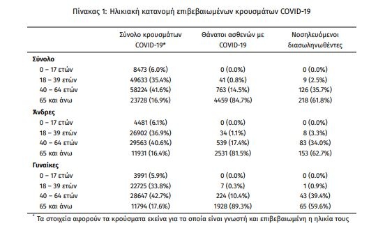 Η ηλικιακή κατανομή των (α) συνολικών κρουσμάτων, (β) των περιστατικών που κατέληξαν σε θάνατο και (γ) των ασθενών που νοσηλεύονται διασωληνωμένοι, είναι η ακόλουθη:
