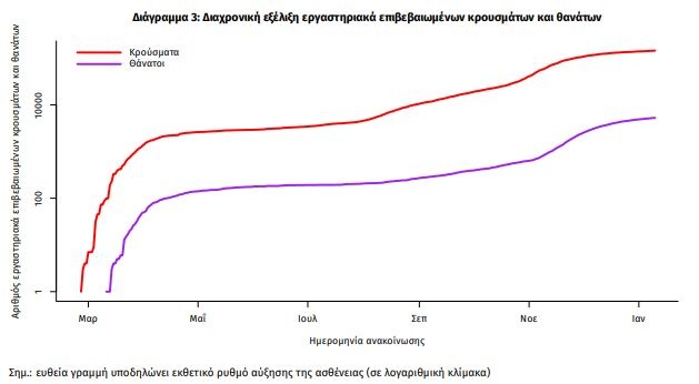 Η διαχρονική εξέλιξη των συνολικών κρουσμάτων και συνολικού αριθμού των θανάτων ασθενών COVID-19 παρουσιάζεται στο ακόλουθο διάγραμμα.