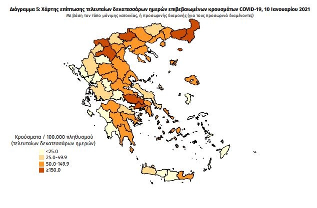 Τα στοιχεία που παρουσιάζονται αφορούν περιστατικά από την επιδημιολογική επιτήρηση της νόσου από το νέο κορονοϊό (COVID-19), με βάση τα δεδομένα που έχουν δηλωθεί στον ΕΟΔΥ και καταγραφεί μέχρι τις 10 Ιανουαρίου 2021 (ώρα 15:00).