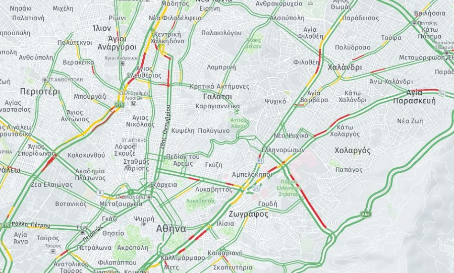 Επίσης, μποτιλιάρισμα σημειώνετια και στην Κατεχάκη (ρεύμα από Ηλιούπολη), στη Λ. Κηφισίας (άνοδος και κάθοδος) και στη Βασ. Κωνσταντίνου.