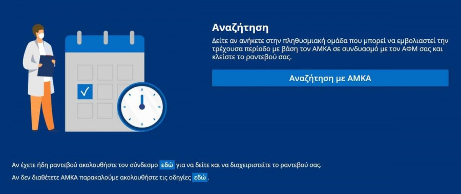 Ο πολίτης, εφόσον είναι εγγεγραμμένος στην άυλη συνταγογράφηση, λαμβάνει αυτόματα ένα sms/email με το προκαθορισμένο σημείο ραντεβού, σε συγκεκριμένη ημέρα και ώρα. Μαζί με τις πληροφορίες του ραντεβού λαμβάνει ειδικό κωδικό επαλήθευσης και σχετικό link, στο οποίο μπορεί να επιβεβαιώσει και να οριστικοποιήσει το ραντεβού του. - Οι πολίτες που δεν είναι εγγεγραμμένοι στην αυλή συνταγογράφηση μπορούν να κλείσουν ραντεβού διαδικτυακά, εισάγοντας τον ΑΜΚΑ τους στη σχετική πλατφόρμα, (emvolio.gov.gr), όπου το σύστημα τους ενημερώνει αυτόματα αν ανήκουν στις ομάδες που εμβολιάζονται τη δεδομένη χρονική στιγμή. Εφόσον ανήκουν στις ομάδες προτεραιότητας, μπορούν να κλείσουν το ραντεβού εισάγοντας τους κωδικούς taxisnet.