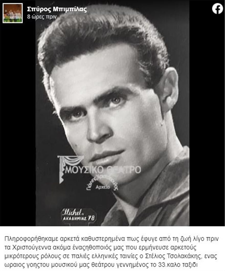 «Πληροφορηθήκαμε αρκετά καθυστερημένα πως έφυγε από τη ζωή λίγο πριν τα Χριστούγεννα ακόμα ένας ηθοποιός μας που ερμήνευσε αρκετούς μικρότερους ρόλους σε παλιές ελληνικές ταινίες ο Στέλιος Τσολακάκης, ένας ωραίος γόης του μουσικού μας θεάτρου γεννημένος το 33. Καλό ταξίδι» έγραψε ο Σπύρος Μπιμπίλας.