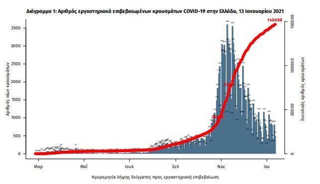 Κορονοϊός - Όλες οι ειδήσεις: Την Τετάρτη, 13 Ιανουαρίου 2021, ο ΕΟΔΥ ανακοίνωσε 671 νέα κρούσματα του νέου ιού στη χώρα, εκ των οποίων 17 εντοπίστηκαν κατόπιν ελέγχων στις πύλες εισόδου της χώρας.
